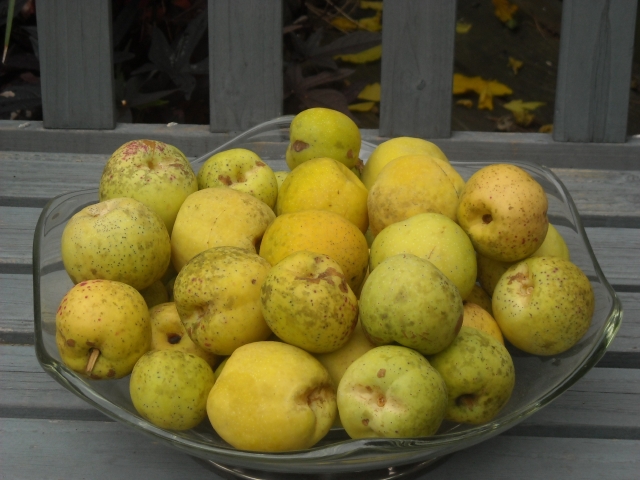 The best fruits this year came from ‘Toyo-Nishiki,’ a quince whose lovely chameleon-like flowers deepen from white to soft pink to rose. We think that its good fruit set might be the result of hard pruning, transplanting, and the final insult, having a tree fall on it. This last is not recommended gardening practice, but it didn’t seem to do any harm. Maybe good soil helped, too.