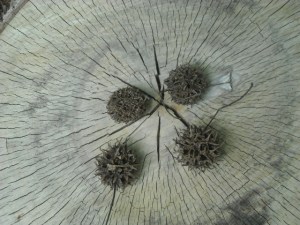 Gumballs on a sweet gum stump. Top two show wear and tear. Bottom two are worthy of gilding or weaponry