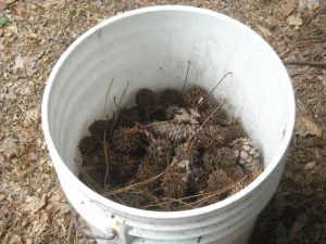 It’s called the gumball bomb strategy. For those who are uninitiated (happily, trust me) to the reproductive habits of the sweet gum tree, it spreads its genes by bombing us with countless spikey balls that give everyone the grumbles. (Everyone, that is, except for creative recyclers who spray them with gold paint and use them in wreaths for the holidays.)