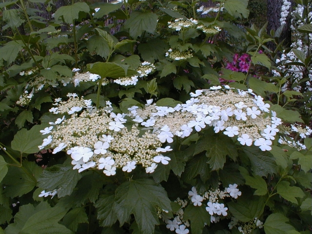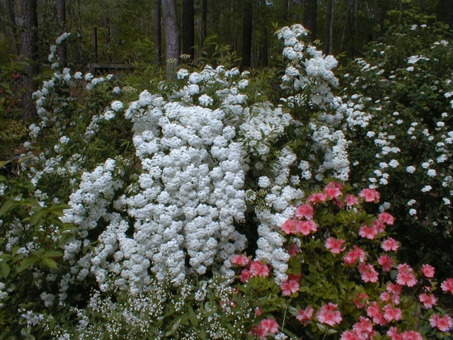 Double reeves spirea, a slip of a gift from campus, now full-grown in our garden plays off a salmon-pink azalea