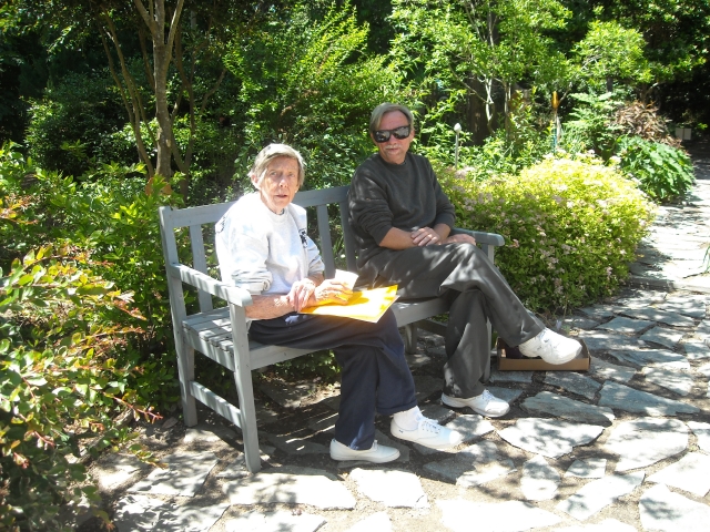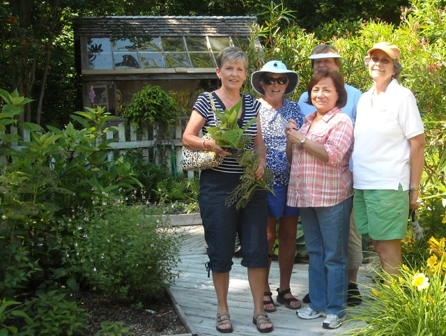 Benches and chairs are scattered through the garden, so when people decide to “set a spell” they can enjoy refreshments served in our garage/studio by Elaine or Anne or Quin. Candy brings a plate of special treats every year, but after our volunteers do serious taste-testing, we’re never quite sure how much is left for visitors. It’s not exactly a café, but the table’s centerpiece, created by Janice with blooms from our garden, and the painted Victorian family that Linda positions among plants around the stone patio add a festive note.