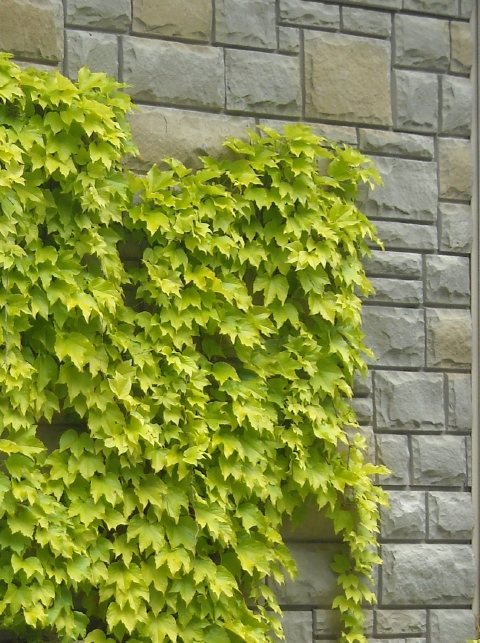 Boston Ivy: (Parthenocissus tricuspidata ‘Fenway Park’) Not an ivy, but a relative of Virginia creeper. This goldy-chartreuse gem is named for the Boston Red Sox stadium. Here it is climbing the faux stone applied to our garage after tree damage from Hurricane Isabel.