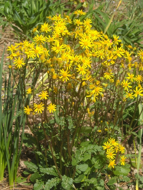 Golden Ragwort: (Senecio aureus or Packera aurea) A native woodland spring bloomer before trees leaf out, rarely used in gardens. Too bad. Bright dazzle-your-eyes gold dandelion-like flowers rise above handsome foliage. Leaves, purple on the undersides, remind me of violet foliage and makes a nice groundcover all season.