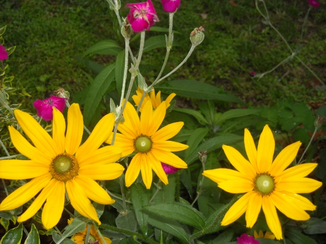 Cutleaf Coneflower: (Rudbeckia laciniata) Not a coneflower. Like all rudbeckias, a native summer bloomer. It grows best in moist soil and is a carefree, vigorous spreader that makes a handsome groundcover all season. Late summer it sends up tall stems capped with masses of yellow daisy-like flowers. But the real show begins when goldfinches alight on the waning flowers and pick over the seeds.