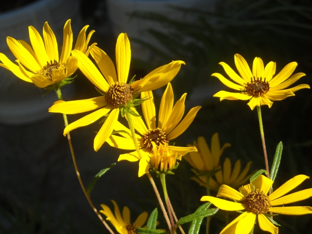 Swamp Sunflower: (Helianthus angustifolius) A native fall bloomer. Tall, with narrow leaves, the plant sometimes looks like tangled hair, but its blooms are a knockout, oases of pollen and nectar for late-browsing insects. It grows easily in moist places but needs room in a naturalized area. (Not near the front door unless you are a nature nut, which I may be, but there are limits.) It reseeds because I leave seed heads for the birds, but seedlings are easy to pull.