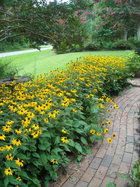 Nothing in this world is perfect. Rudbeckia can be as wandery as wire grass, so we had to figure out a way to keep it from ravaging plants that were flanking it. We finally sank a 1 by 6-inch plank along the length of the flower bed. This fix has been in for a few years and, except for an occasional intrepid jumper, the rudbeckia remains contained.