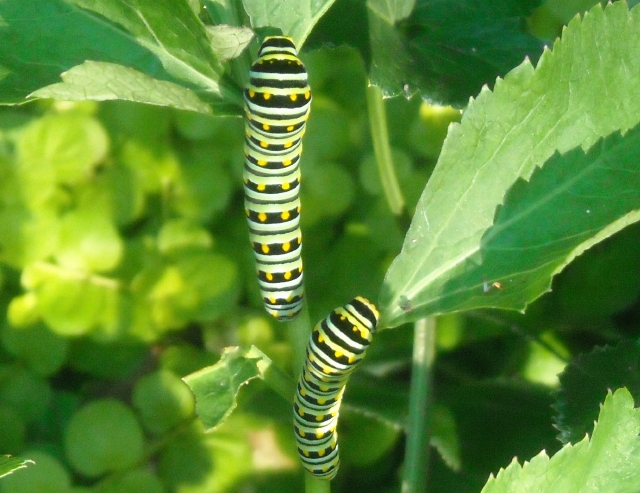 Black swallowtail caterpillars, sometimes called parsley worms, enjoying golden alexander