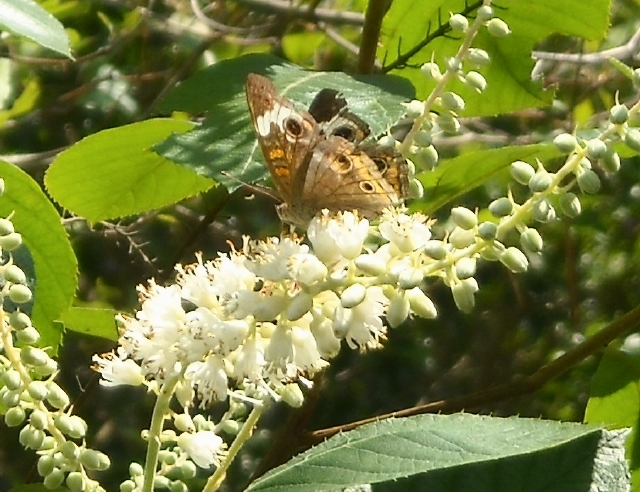 buttbuck3Sweet pepperbush, a native plant of moist areas that does well in gardens, buzzes with activity during its long bloom period. Its heavenly scent fills the air and bumblebees, wasps and butterflies flock to it. Here a buckeye butterfly is nestled in its blooms.