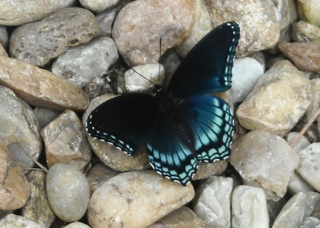 buttredsptpurThe beautiful red-spotted purple butterfly is a member of the Admirals group of brush-footed butterflies, though it is not purple and in this photo the red spots on the forewing are inconspicuous. Its larva feeds mostly on wild cherry, which grows in our woods. We’ve only seen singles each summer, no mating dances, and only for a day or two, often on our driveway as pictured, though one year, late, I spotted one on goldenrod.