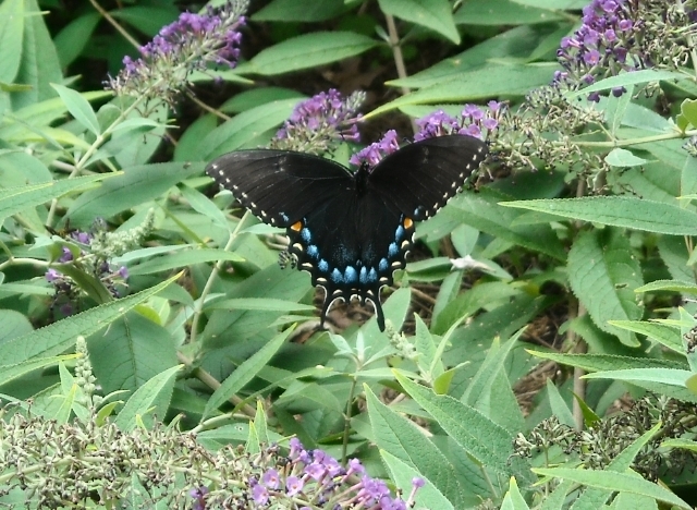 butttigblkFemale eastern tiger swallowtails have two morphs, a light and a dark. For several days I have seen this female feeding on dwarf butterfly bushes called ‘Lilac Chip,’ one of the recently introduced Lo and Behold series. They are seedless and rebloom until frost without deadheading. I trim them occasionally to keep them looking fresh. So far they are staying around two feet, but they are young.
