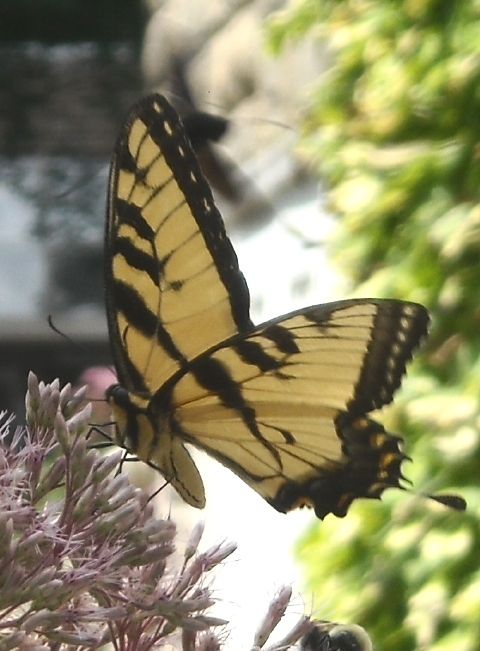 butttigmaleThis male eastern tiger swallowtail is a repeat visitor to Joepyeweed, a tall native plant of moist sites. Its large showy flower heads are composed of many small blossoms that open over time. Once they begin to open, the word goes out and Joepyeweed becomes a fast-food stop, not just for swallowtails, but for an amazing variety of nectar-sipping insects.