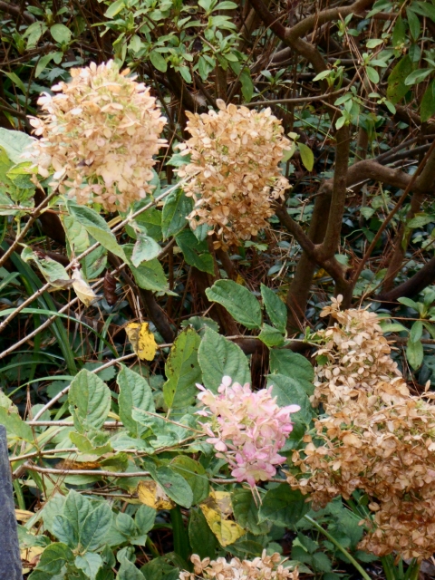 Listen to the Litany of the Tatters: broken ferns, frayed solomon’s seal, blotched hydrangea leaves. Oh, quichyer whining, you say. That’s only the usual fall die-off. Wait, I say, now we get to the drama.