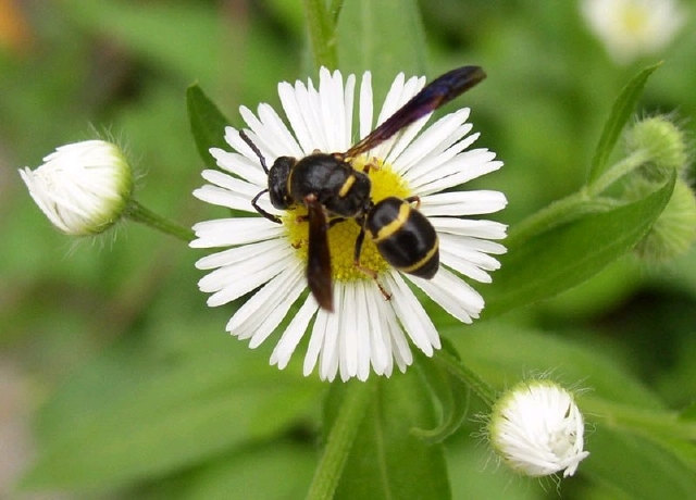 Larvae of potter wasps eat caterpillars and beetle larvae stashed in their mud “pots.” Non-aggressive adults sip nectar. Beatriz Moisset