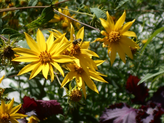 Woodland sunflower: tall and wandery, jovial, splashing clear yellow over the bed; easy to pull when it gets too tipsy but can be a bear if it roots where you don’t want it.