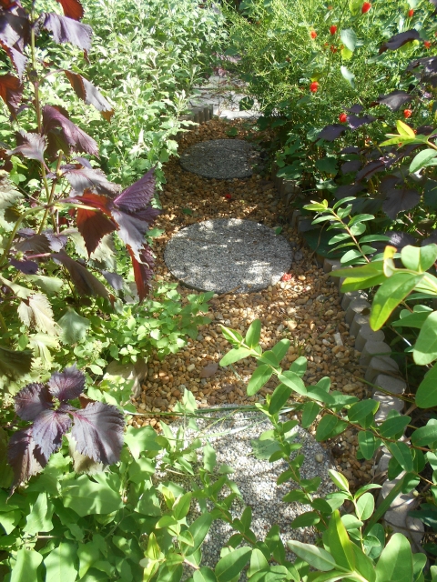 Today, concrete edgers frame the small path of river run and stepping stones to keep wayward plants in place(?)