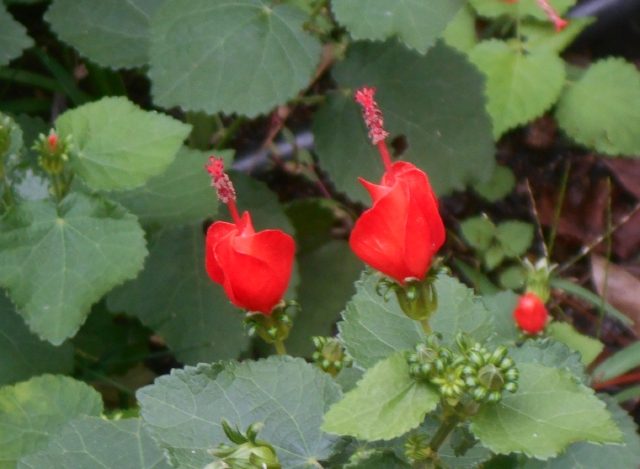 Turks cap: not a true buzzer, but a sweet, three-foot-high hibiscus whose small red flowers look like pinwheels from above. Its long red pistil sticks out its tongue (enticing hummingbirds?). Nice nestled among starry white asters