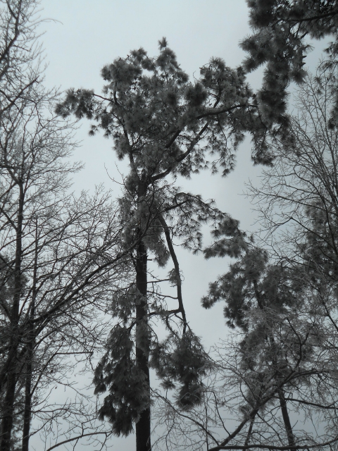 One warblerish bird (pine, prairie warbler?) sits fluffed and still, eyes closed, wings akimbo, on the icy floor of the gazebo. We want to cradle it, warm it on its away, at least give it some boots, but there is no point in terrorizing the creature. It’s there for the longest time before it opens its eyes, bobs its head, straightens, and flies off at some signal.
