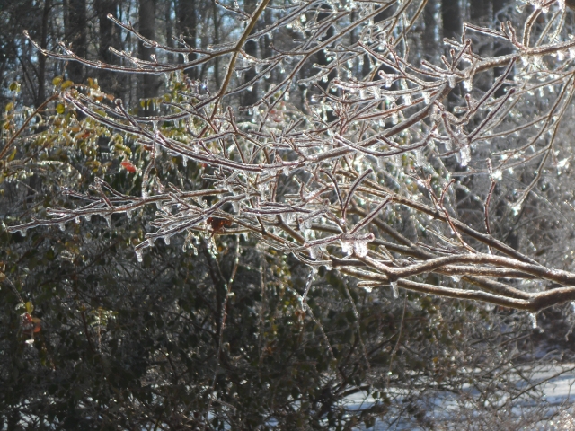 We were shut down here for a couple of days, secondary roads not clear, provided with suggestions from the electric company about how to conserve power, in particular the postponing of laundry chores if possible. Indeed, that certainly was possible, and what a fine idea. Now a benevolent sun is doing its own brand of clean up, dissolving icicles everywhere, sending them off in torrents of brittle rain showers that crackle as they fall. You northerners might laugh at our paralysis during winter storms, but we southerners are not used to such indignities.