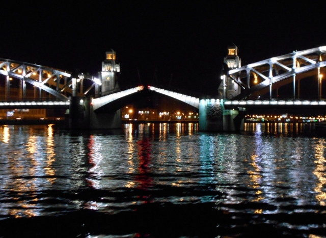 After one o’clock in the morning the bridges on the Neva rise to allow barge and sightseeing traffic. The River Neva divides this city on a swamp that Peter the Great built in the early 1700s. Well, actually it was the serfs, dragooned by the thousands, who drained the swamps, dug the canals, built up the land by hand, literally – they were always short of shovels and wheel barrows — and died for this Venice of the North that became Russia’s glittering window to the west.