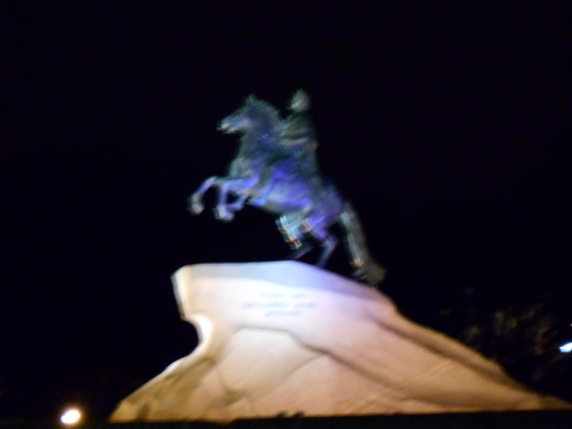 We turned to go, and we saw the magnificent Bronze Horseman. I can’t imagine, as we sprinted for the boat, how we could have missed that mammoth statue of Peter the Great bathed in blue and mounted on a monumental rock, Thunder Rock, it’s called.