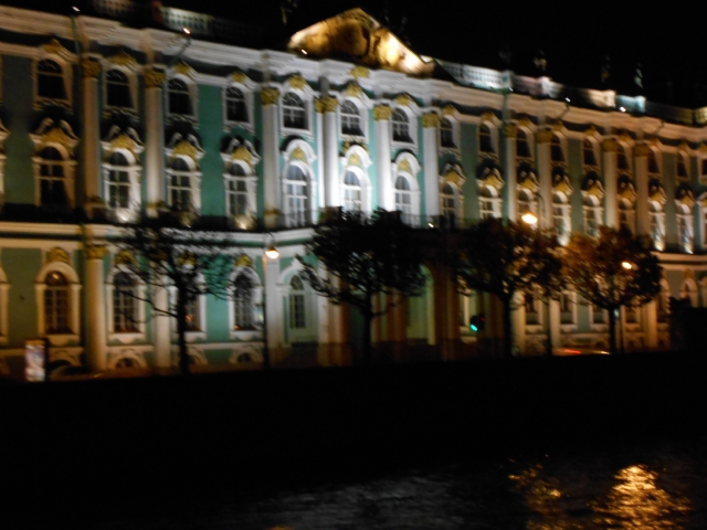 Day or night, this must be one of the most spectacular waterfronts in Europe, especially with piped-in music by Tschaikovsky. The boat idled as bridges opened to let us pass. We were mesmerized by disembodied patterns of light floating up in the night.