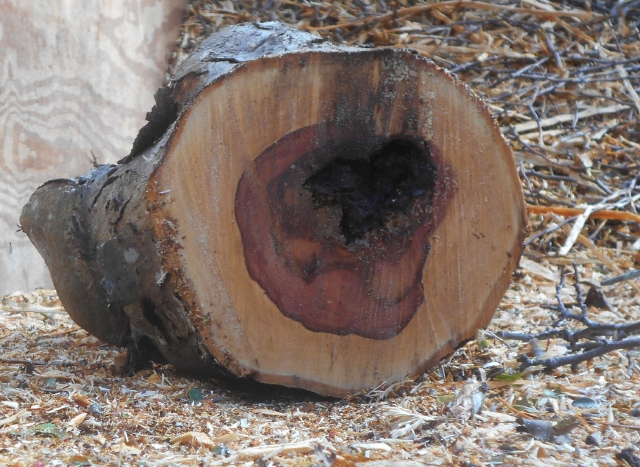 Normal crabapple heartwood is reddish brown. This tree’s heartwood was shot through with black stigma, a sure sign of rot within. Somewhere in the trunk there was a tiny cavern where two slugs were spotted, probably enjoying a cool dark moist hangout.