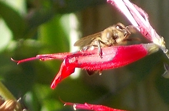 Honeybee color vision is shifted toward the blue end of the spectrum. They see ultraviolet rays but red becomes black. I’m betting there’s some blue hidden in those sage blooms (dying blooms become soft fuchsia), and some ultraviolet, too. Ultraviolet rays can create patterns and runways, invisible to us, that guide a honeybee to dinner. Do the bees see red sage as deep blue?