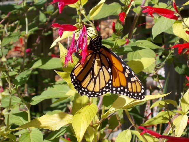 A few feet away, in the sun, pineapple sage was blooming with fire, and here was the carnival. There was My Monarch in staccato action, moving from bloom to bloom. Topsy turvy much of the time, legs clasping and reclasping each flower, wings folded or fluttering for balance, antennae waving, proboscis going deep, or maybe not, hard to say with all the acrobatics, but so determined to drink from those long, tubular flowers she never noticed me. I could have reached out and picked her off. (The slide show below catches more acrobatics, but stills don’t capture her boundless energy.)