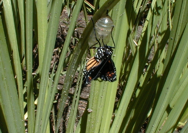 Chrysalis is darkened by the monarch’s body, its god buttons shine, as, the butterfly prepares to emerge