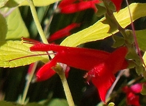 Up close, a sage bloom is beautiful, long pistil extending beyond petals, stamens, with pollen barely seen, closely held