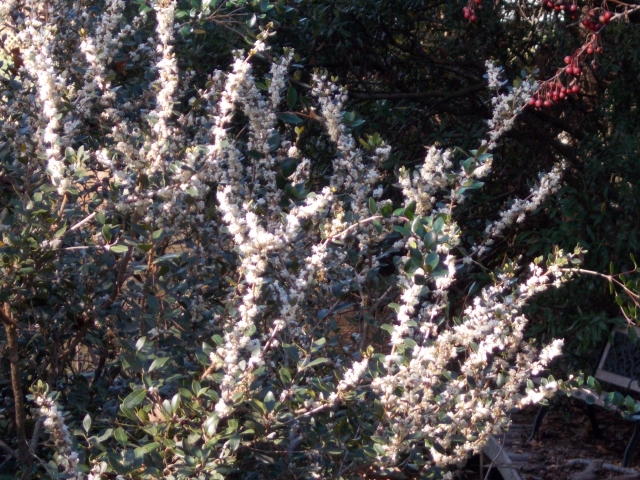 A week or so later our holly-leaf osmanthus came into lavish bloom, a first for this ten-year-old. An eastern sun was sidling among the trees, casting its spotlight on buttons of small, oh so fragrant flowers climbing stiff branches. The wands of white flowers shined. Crowds of insects zipped in and around them, and sunshine reflected off their bodies and they sparkled like scatterings of gold dust.