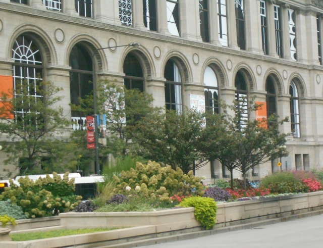 Panicle hydrangeas, sweet potato vines, grasses and flowering trees punctuate the islands along Michigan Ave