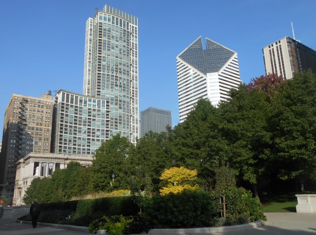 Skyscrapers rise above the gardens in Millennium Park