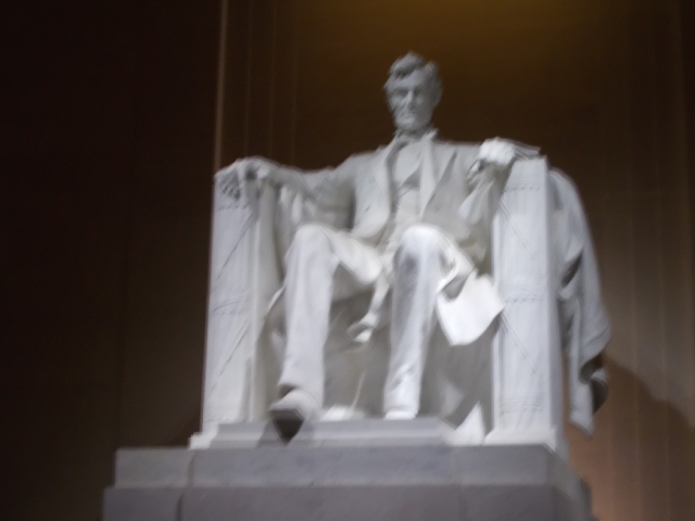 And finally, the Lincoln Memorial. Quiet, reverent, glowing at night. Crowded during the day with people on holiday, many taking family photos under the kindly gaze of Abe. Kids being kids, some can’t resist using the slopes along the steps as old-fashioned sliding ponds.
