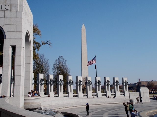 Grandest of all, perhaps is the World War II Memorial. An ellipse of pillars, it lies in the shadow of the Washington monument at the end of the Reflecting Pool.