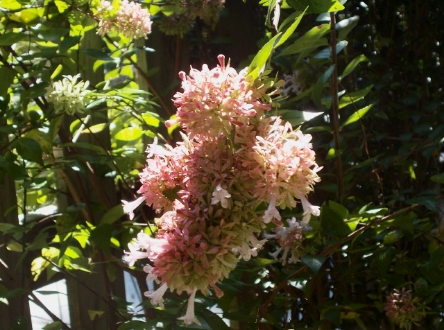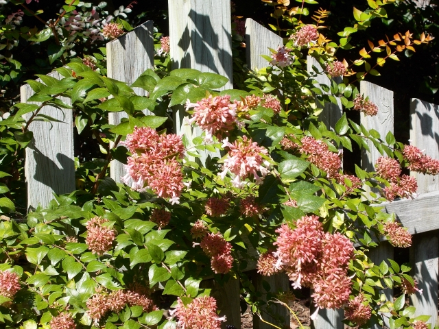 A closer look at Canyon Creek abelia, bees and butterflies methodically forage the white flowers surrounded by bright pink sepals