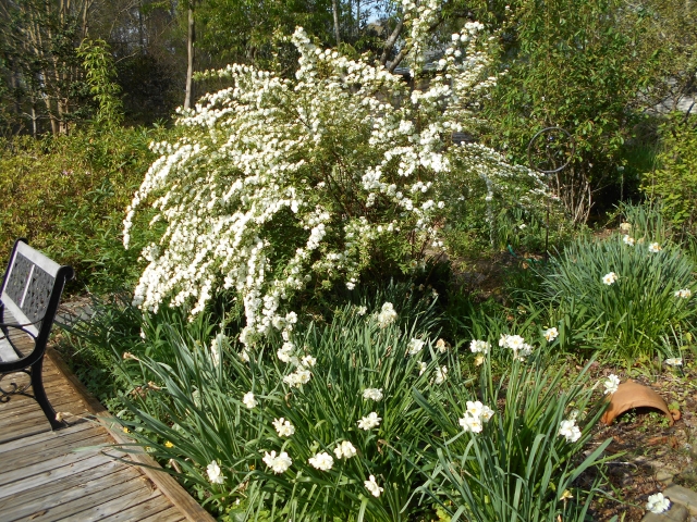 Exuberant spirea ‘Double Reeves’ and daffodils ‘Erlicheer’