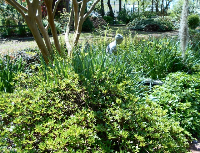 Possibly too green? This energetic growth is outstripping some of our azalea blooms, hiding them so the full “wow” effect of bright blossoms is subdued. Reminds me of why we gave up on Rhododendron catawbiense with its stunning lavender balls that cover walls of healthy shrubs in the cool-climate forests of western North Carolina. Warm spring temperatures here confused their internal schedules and prompted plants to put out new leaves before the blooms arrived. That meant the “wow” effect was a dud.