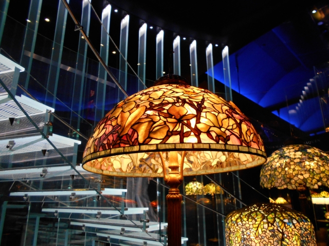 Czech architect Eva Jiřičná designed the surreal gallery with its floating, illuminated staircase and shadowy alcoves. Here, against a dramatic backdrop, a hundred Tiffany lamps are showcased, most of them donated by a single collector, Dr. Egon Neustadt, an early admirer of Tiffany.