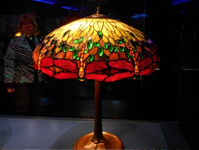 Created in a variety of color themes, the dragonfly lamp was a popular item. Note how Susan fades into the background, barely three feet away