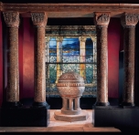 Tiffany designed the dramatic field-of- lilies windows, but who actually executed them? Aside: The shape of the baptismal font may have been the inspiration for future Tiffany lampshades.