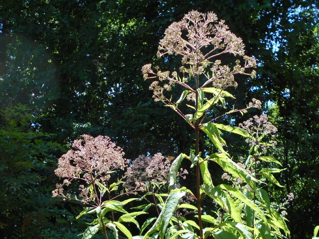 Joepyeweed was especially exuberant this year, crowding neighbors, because we had so much rain, 15 inches in the month of June alone. Now it is wilting on hot summer days