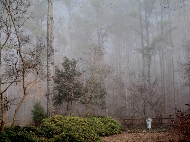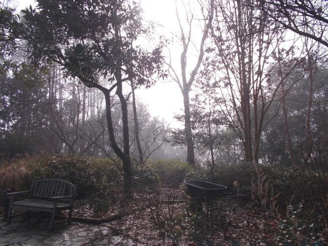 Shorn of color, isolated by mist, the rangy bones of the garden, the storm-scars and misshapen ancestry of former seasons emerge.