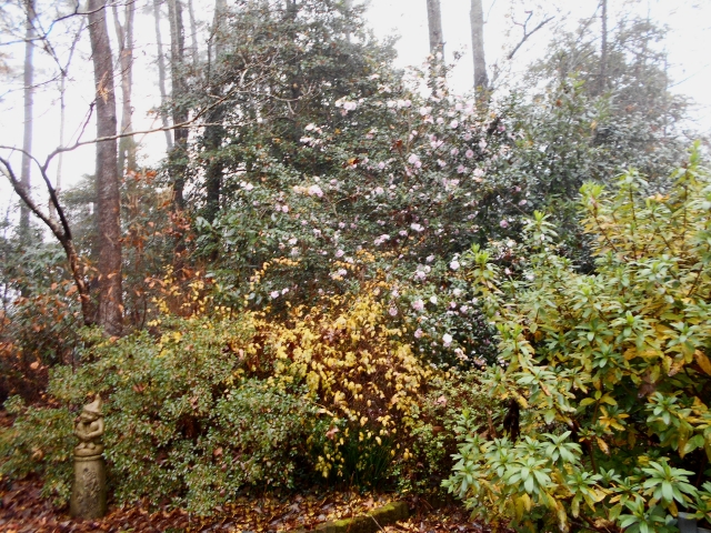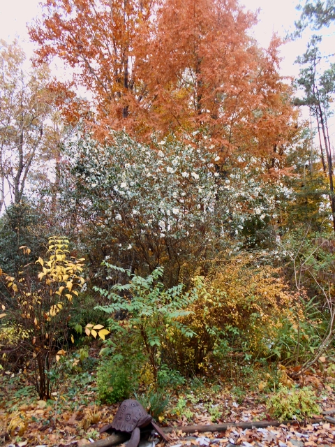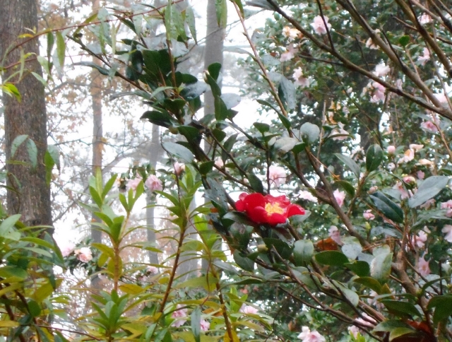 And the camellias, fall bloomers fading, spring bloomer in the wings. That single blossom on an aging ‘Yuletide’ is especially satisfying, since the plant lost most of its girth to a cold winter.