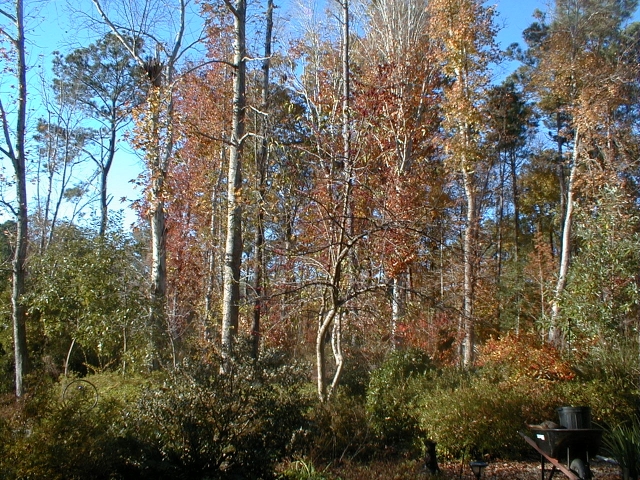 The ramrod tulip tree, whose seed germinated the summer we built our house, stands like an emperor blending quietly into the woods behind.