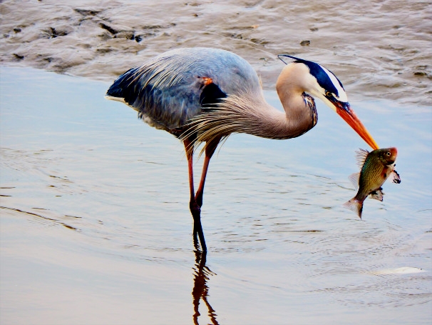 When he doesn’t miss, now that is something to see. By rights, the impaled fish should remain stuck on his beak. Not so. With a flick of his head the heron releases the fish, tosses it easily into the air, and gulps it down whole. So fast it’s hard to take in. If the fish is big enough, we can watch the lump make its way down that long neck.