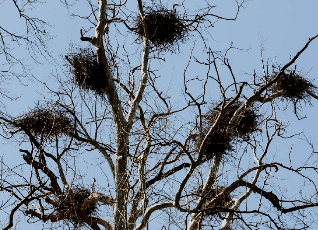 Herons create group hobo camps when they breed, build their twiggy nests in the branches of unlucky trees. Nobody tends to housekeeping, so by the time the demanding, noisy young gobble fish regurgitated by their parents, then splatter poop everywhere, the colony can quickly become a whitewashed slum with a nose-busting stench.
