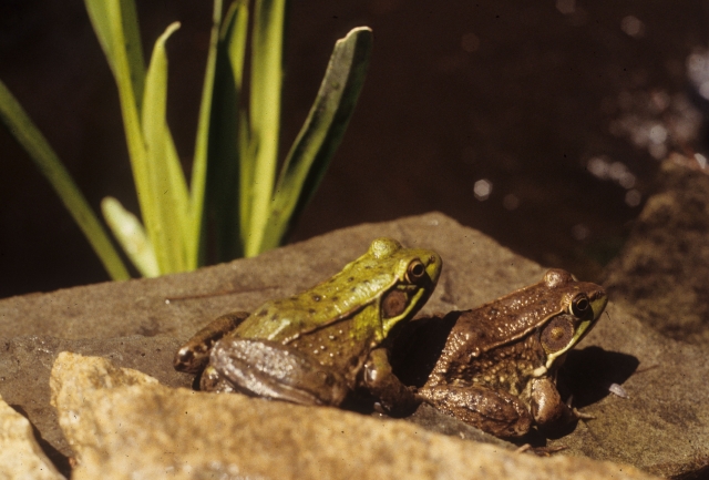A resident green frog chirrups around lunchtime. And dragonflies loaf on spikey stems of pickerel weed.