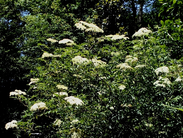 Striking, tall elderberry, grown up from a wayfaring seed, with large white clusters that bring bees in spring, then birds in late summer for the dark berries — if the mockingbird allows them a nip or two.
