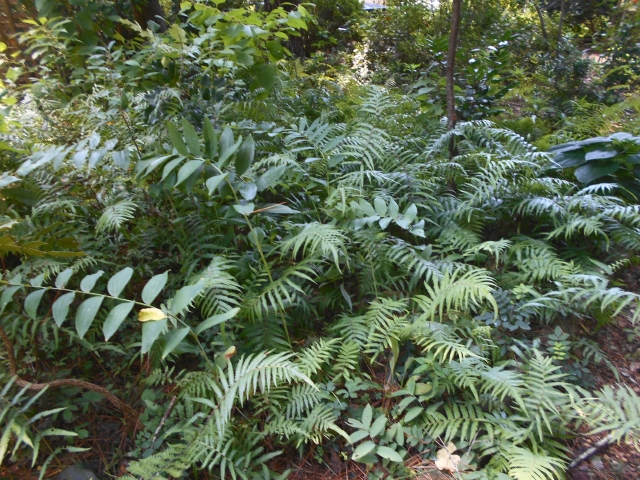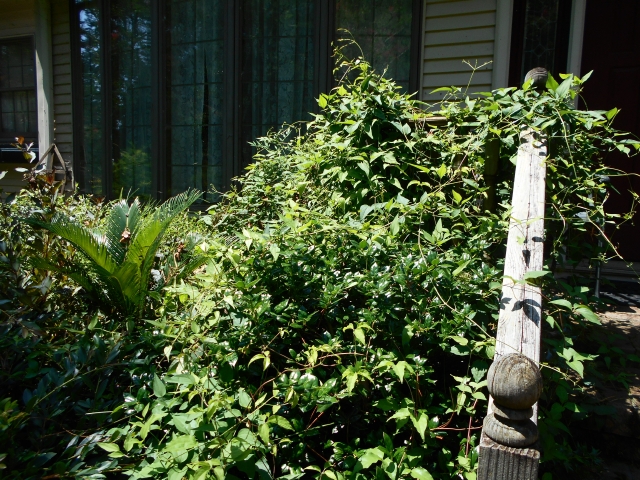 Enormous Solomon’s seal, a volunteer, holding its own. Can’t really see the shrub-toughies, can you? (A renegade band is pictured in the poison ivy photo)